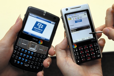 | 透過BlackBerry的BBC方案,臺灣的企業可以透過台灣大哥大以Sony Ericssion P1i(如圖右)以及華碩M530W使用原本黑莓機才提供的服務。 |