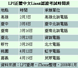 Linux目前有3張比較知名的國際認證考試,分別是廠商為主Red Hat的RHCE,和Novell(網威)的NCLP等Linux認證外,還有另外一個中立型的Linux考試,由LPI(Linux Professional Institute)推廣的 Linux認證。其中,中立型的LPI Linux認證,在去年8月,首度與臺灣社群酷學園試辦第一次的LPI正體中文Linux認證的紙本考試後,從今年2月開始,LPI將與國際認證聯盟陸續於臺中、高雄、臺南、新竹及臺北等地,舉行2008年LPI正體中文第1季巡迴考試。