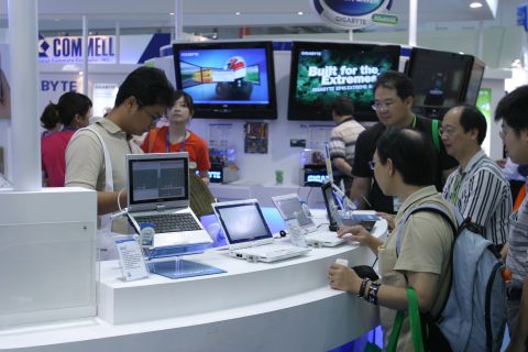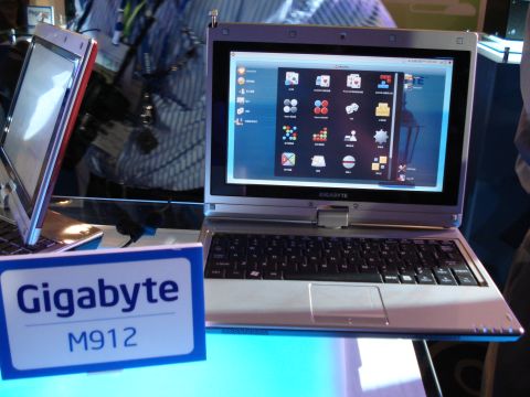 在Computex中,除了英特爾與華碩兩位始祖外,其他業者也在攤位上展示超低價電腦。圖為技嘉攤位展示情形,其所推出的M912為8.9吋netbook,和其他業者多以一般筆電外型設計不同,M912採用平板電腦設計,可翻轉螢幕並觸控使用,預定第三季推出。
