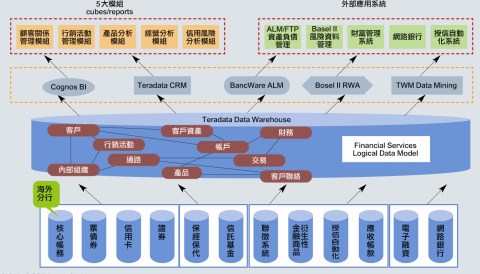 彰化銀行的資料倉儲架構,主要區分為邏輯資料層以及前置資料超市,其中,邏輯資料層的資料是來自前端各個應用系統,例如:核心帳務系統以及網路銀行等;而前置資料超市則是依據使用者需求,所建置的不同前置資料超市,例如:新巴賽爾協定前置資料超市等,其中的資料來源與模型建置,則是以邏輯資料層的資料為基準。![]() |