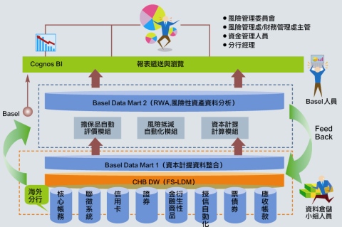 最近這一年來,銀行業者最關注的議題之一,就是新巴賽爾協定,彰化銀行也無法置身事外。為了符合新巴賽爾協定的要求,彰化銀行在2年前啟動「資料模型提升專案」,擴充聯徵系統、授信自動化以及網路銀行等多個資料源,去年9月,資料倉儲開始支援資產負債管理系統(Asset Liability Management,ALM)以及新巴賽爾系統之後,彰化銀行的資料倉儲平臺首度把所有的帳務與交易資料匯集到資料倉儲,而資料倉儲也從此成為彰化銀行所有分析應用的單一資料來源。