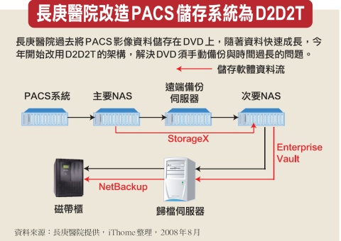此外,也因為採用DVD作為儲存媒介,PACS的備援時間逐漸無法符合需求。何國豪表示,DVD備援的速度太慢,而且必須透過人工操作備份機制,使得很多分院有的時候為了省麻煩,沒有做到PACS每天備份,或者根本不做備份。加上長庚醫院PACS系統的影像資料量每年都快速增加,備份的問題就越來越嚴重。何國豪以林口院區的PACS影像資料量為例,2006年上半年每個月約為380GB,但到了今年2月,每個月的影像資料量就已達到660GB。到了今年7月,每個月的影像資料量已經成長至720GB。