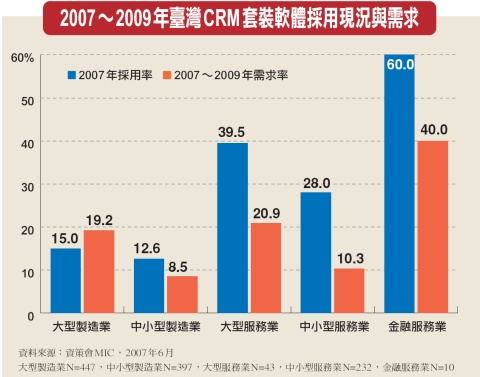 根據資策會市場情報中心MIC的調查,目前臺灣的各個產業仍有CRM建置需求,以金融服務業來說,雖然已經有6成企業完成CRM建置,不過,2009年的建置需求率依舊高達4成,顯示企業對於CRM的需求殷切。
