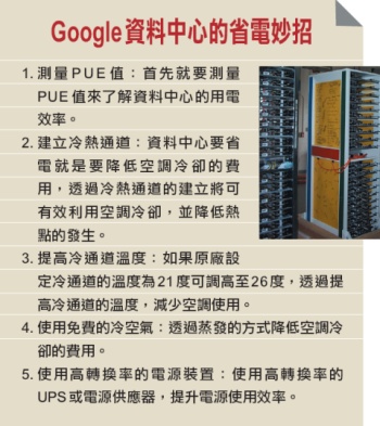 根據Google的資料,Google六座資料中心平均PUE值為1.21,目前臺灣企業資料中心的PUE值平均為2.5,歐美國家的PUE值平均則為2,PUE值越低,代表著機房空調冷卻所需的電力就會更少,Google幾乎做到最高標準的資料中心節能目標。Google日前發布一個專屬網站,告訴大家Google如何透過4種方法打造出高能源使用效率的資料中心。