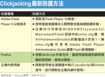 NoScript外掛元件只支援Firefox,其他瀏覽器則還未針對Clickjacking提出修補程式。目前,國外多數資安專家則建議使用者直接關閉Javascript功能,方能徹底確保安全。