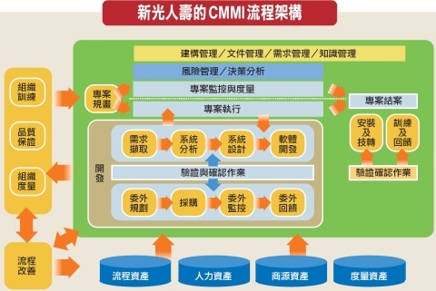 新光人壽為了改善這些問題,3年多前開始導入CMMI,就特別著重系統開發以及專案管理。新光人壽電子商務服務部經理周裕峰表示,系統開發與專案管理其實環環相扣,導入CMMI的價值,在於所有的人都必須遵循同一種標準與做法。