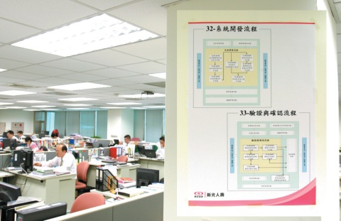 | 新光人壽雖然已經在日前取得CMMI Level 3認證,但是,走進電子商務服務部,仍可看到相關的改善指標與流程架構圖,緊緊地附著在每一個牆柱上,新光人壽落實CMMI的決心不言可喻。 |