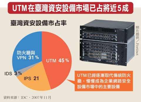 調查機構IDC預測,2011年時UTM設備將占網路安全市場5成的市占率,未來UTM在企業中扮演安全節點的角色將會更吃重。而明年開始,將會有越來越多UTM產品往上述這些方向發展,支援更多不同的功能。在UTM已經逐漸開始取代傳統防火牆的地位,成為企業網路不可或缺的基礎設施的此時,更多功能的支援,將意味著更能吸引企業的青睞。對此,張志淵說:「根據我的經驗,的確現在功能性是很多客戶在選擇UTM產品時的重要考量,實際上客戶是否真的會開啟這麼多功能並不重要,即便是企業僅使用單一功能,越多功能的UTM產品,還是會對客戶產生一定的吸引力。」由此不難看出,UTM廠商持續增加功能性的舉動,對於企業來說還是有一定的吸引力。文⊙劉哲銘