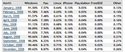 Net Applications的數據顯示,Windows XP的市佔率仍位居第一,佔66.31%,其次是Windows Vista的20.45%,MacIntel以6.51%位居第三,Mac OS以2.35%排行第四,第五名亦是Windows 2000的1.56%,Linux以0.83%排名第六。