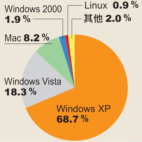 微軟日前宣布將在2010年推出下一代作業系統Windows 7,不過,根據Net Applications的調查,目前個人電腦的作業系統市占率,仍以Windows XP為主流,市占率達到68.7%,至於最新推出的Windows Vista僅占18.3%,除此之外,Mac OS作業系統以8.2%占居第3,其他依序是Windows 2000,占1.9%,Linux則占0.9%,其他2.0%。文⊙楊惠芬