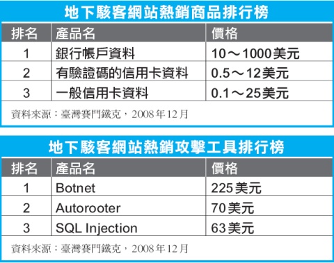 該報告指出,1個具有信用卡背面3碼授權碼的信用卡資料,只需要0.5美元(約臺幣16元)~12美元(約臺幣384元)就可買到,價差視該信用卡額度和卡友的信用程度有所不同。而地下經濟伺服器也是許多駭客攻擊工具交易的地方,以傀儡網路(Botnet)平均225美元(約臺幣7,200元)價值最高。不過,臺灣賽門鐵克資深技術顧問莊添發指出,臺灣許多駭客工具都從中國地下駭客網站購買,常見的方式是採會員制,VIP年費人民幣199元(約臺幣1,000元),網站內所有工具1年內都可免費使用,終身會員人民幣299元(約臺幣1,500元),還送專人技術指導。文⊙黃彥棻