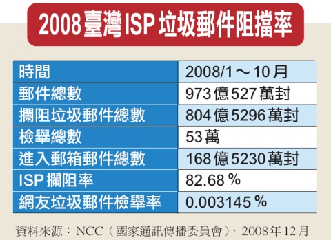 NCC從2007年開始,要求臺灣前20大ISP業者必須回報每個月垃圾郵件處理的數量。從2008年1月~10月的統計結果來看,ISP業者對垃圾郵件的攔阻率已經超過8成。不過,對於網路使用者而言,卻只有不到1%(0.7%)的網友,每天不會收到任何垃圾郵件。