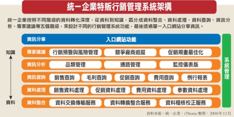 從系統權限上,統一將行銷管理系統區分成3個層級,包括績效面、管理面、營運面三種。績效面的權限,開放給特販部在統一內部的上游客戶,例如其他事業群主管,主管可以了解特販客戶任何一家店所銷售的食品產品數量和金額,統一花費的行銷費用、甚至是促銷計畫的核准過程,都可以在系統中呈現。