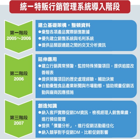 為了能掌握每一項產品的銷售狀況,統一開始打造行銷管理系統。統一特販部部主管經理魏健生希望能夠做到,第二天上午,就可以從系統看到任何一家店的銷售資料。他說:「目標是隨時隨地,都能夠獲取所需,掌控通路銷售進度,來調配行銷活動。」