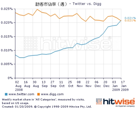 Hitwise研究總監Heather Dougherty周二(1/20)在部落格上指出,上周末微型部落格Twitter的訪客市佔率首度超越新聞社群網站Digg,在電腦及網路類別中已排行第84,略勝Digg的85名。從Hitwise公布的兩站造訪市佔率圖表可看出,自去年8月迄今,Twitter訪客穩定向上成長,而Digg則有緩慢下滑趨勢,到上周末兩個網站造訪率同時達到0.021%。