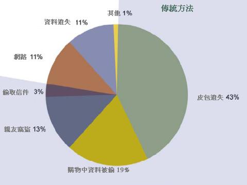 Javelin Strategy and Research發表2008年美國身份詐騙研究報告(PDF檔,391KB)顯示,個人資料在網路上被竊取的比例只佔11%,但因皮包遺失所佔的比例高達43%,親友竊盜佔了13%。