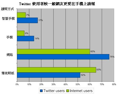 Twitter使用者也比不用Twitter的網友較不愛讀傳統報紙(76% vs. 60%),較愛讀網路報(14% vs. 6%),也較愛在手機上看報(17% vs. 7%)。以手機看影音新聞比例為6% vs. 1%,以智慧型手機觀看比例影音新聞為8% vs. 1%。