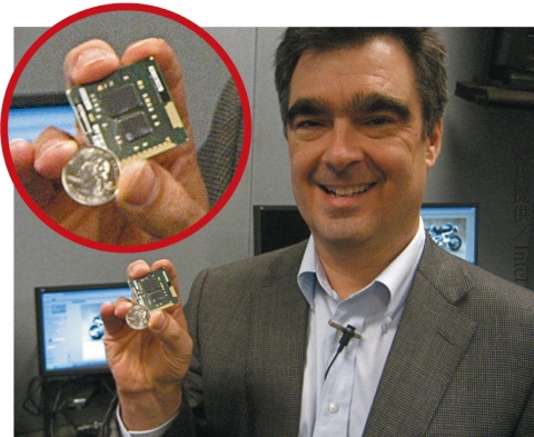 | 英特爾副總裁Steve Smith展示首款整合繪圖晶片的32奈米處理器。照片提供/英特爾 |