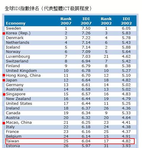 若按NCC所提供的數據計算,2007年台灣全球IDI排名為第13,在亞洲落後於南韓(2)、香港(11),及日本(12),但超越澳門(21)及新加坡(15)。