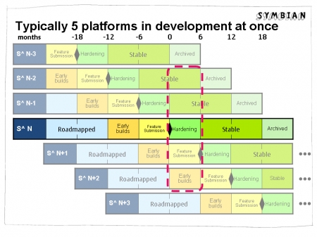每個版本時程及其所必須完成的工作則由Symbian基金會的版本審議會負責評估,例如在完整功能版出爐前該平台主要在蒐集新功能,在完整功能版及正式版間則是在修補臭蟲及提昇穩定度。在正式版階段雖然仍會持續修補臭蟲,開發人員主要的力氣則會花在下一階段的新版本上。