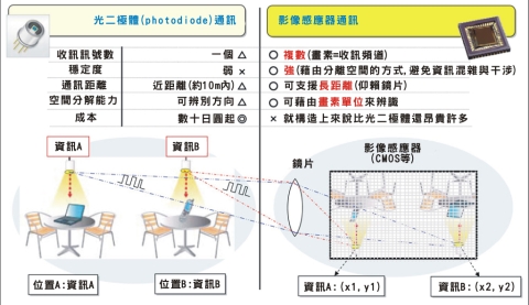 舊式『光二極體通訊方式』與新研發的『影像感應器通訊方式』比較圖。(製圖:Visible Light Communications Consortium) 看大圖