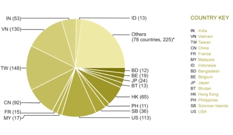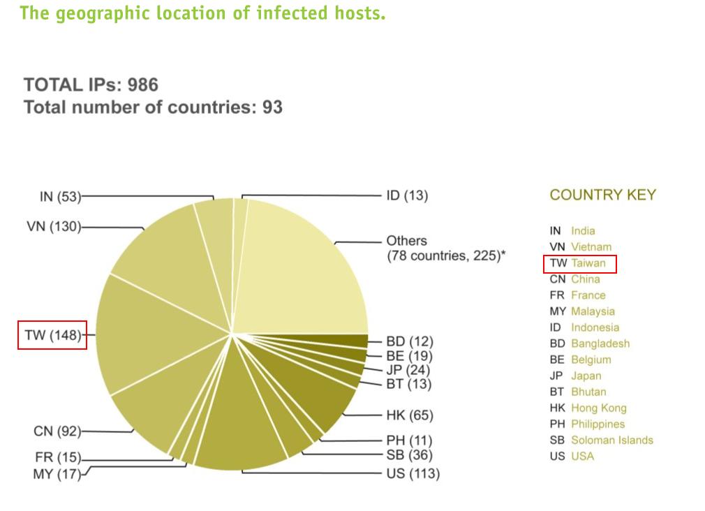全球93個國家,986個受感染IP裡,各國所佔的數字顯示,台灣第一,接著是越南、美國、中國,及印度。看大圖