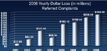不過詐騙金額則一直維持增加的趨勢,2008年總計達2億6459萬美金,較2007年的2億3909億增加一成。