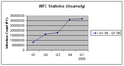 根據該份報告內容,與2008年相比,2009年第一季台灣電腦感染病毒次數較去年同期成長297%,並達到2008年整年7351萬次將近一半。感染次數之高更讓台灣擠身全球感染次數最多國家第4名,僅次於美國、日本、義大利,排名在中國之前。