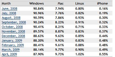 根據Net Applications所列出的前四大作業系統,除了Windows自去年6月的90.84%下滑到今年4月的87.9%外,其他作業系統市佔率皆呈成長趨勢,包括Mac自7.94%成長到9.73%,Linux自0.8%成長到1.02%,iPhone亦自0.16%成長到0.55%。