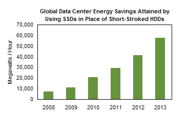 iSuppli儲存系統分析師Krishna Chander說明,固態硬碟可能可取代10%資料中心所使用的高階及高轉速硬碟,這些硬碟通常可快速處理資料讀寫,每分鐘15000轉的Serial-Attached SCSI硬碟每天約使用14瓦特的電力,但固態硬碟則僅要7瓦特,可省下一半的電力,因此就算企業資料中心僅部署小部份的固態硬碟,都可節省大量電力。