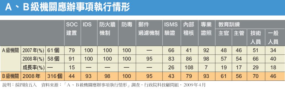 萬其超表示,政府部門依據功能與重要性分成A、B、C級單位,在資安議題上,A級是主力單位,付出的努力、在乎程度和自覺性,也是所有單位中最好的。根據行政院在今年1~3月底針對58個A級機關、316個B級機關所進行的「A、B級機關應辦事項執行情形」調查,在諸多資安事項的達成率中,A級單位在部署IDS、防火牆和防毒機制的達成率達到100%,B級機關只有在防毒機制建置上的達成率達到100%。