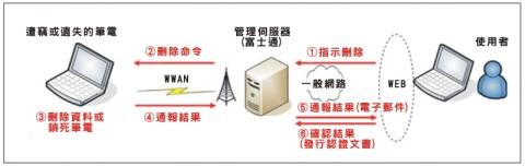 另外,企業在遺失筆電時也可以先遙控鎖死筆電電源令其無法啟動,並藉由啟動電源鎖死功能,讓筆電與距離最近的PHS基地台經緯度來搜尋本體,真的無法尋獲時再啟動資料刪除功能。