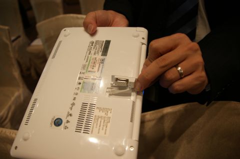 1008HA週邊的I/O埠均採隱藏式設計,包括2個USB埠、乙太網路及Mini VGA埠都藏身於防塵蓋內。為方便外接一般螢幕,如下圖所示,1008HA底部收納一個Mini VGA轉標準VGA器,需要外接螢幕時可取出轉接Mini VGA使用。