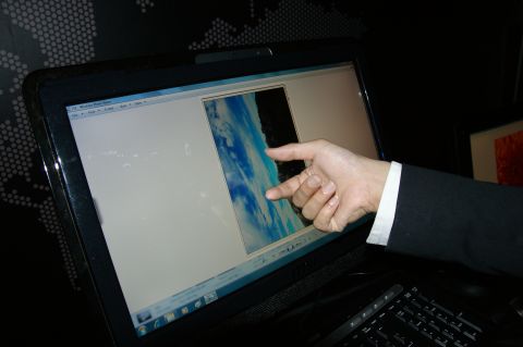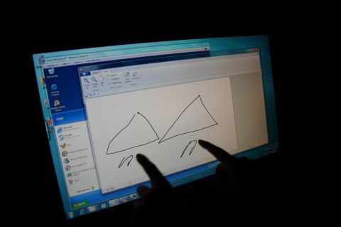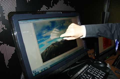 第二種則是多點觸控設計,以Windows 7 Ultimate作業系統搭配可感應多點的觸控面板,例如可在螢幕上翻看相片,二根手指在螢幕上就可翻轉數位相片: