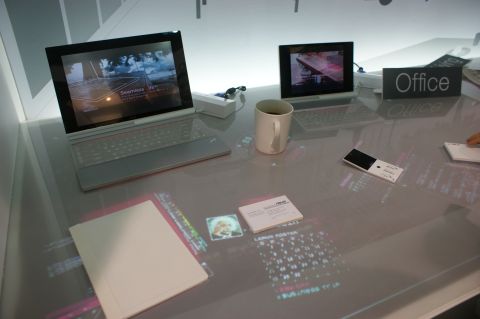 現場也展示一款概念電腦桌,只要放上物品,電腦桌就會自動透過攝影機偵測物品,並以投影機投影內容。