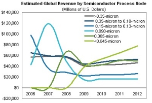 舊的90nm製程所帶來的營收在高點之後急速縮小,而較新的65nm製程高峰之後並不像90nm那樣快速減少。iSuppli預測,接下來的45nm未來幾年還將繼續成為半導體產業主要營收來源。