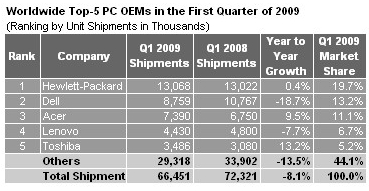 iSuppli分析師表示,受全球不景氣衝擊,第一季PC市場表現較iSuppli原先預期的YoY衰退4%還差。其中桌上型電腦出貨量較去年同期下滑了23%,拖累了整體PC的出貨。但筆電的出貨量則較去年同期成長10%。