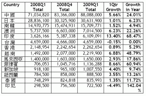 寬頻論壇(Broadband Forum)在上周於新加坡舉行的CommunicAsia2009高峰會中宣布,今年第一季全球寬頻用戶成長了1660萬,亞洲成長率居全球之冠,而中國則以8800萬的寬頻網路線領先全球。