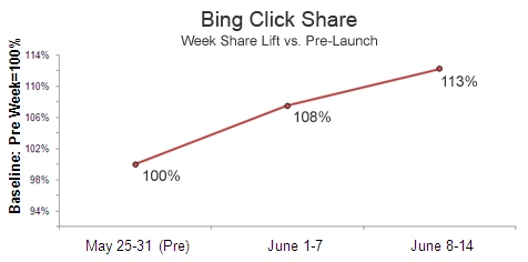 市場研究機構comScore也持續觀察Bing的成長現況,發現Bing發表第一周的搜尋滲透率自13.7%成長到15.8%,而搜尋結果頁面的市佔率則自9.1%成長到13.3%,第二周Bing仍呈成長狀態,搜尋滲透率達到16.7%,而搜尋結果頁面市佔率則為12.1%。