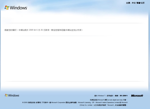 這個以「Windows 7升級選擇」(Windows7UpgradeOption)為名的網站上,目前寫著:「感謝您的關切。本網站將於 2009 年 6 月 26 日啟用,歡迎您屆時蒞臨本網站並加以利用。」