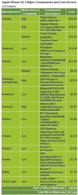市調機構iSuppli發表一份拆解分析(teardown analysis)報告指出,新款iPhone 3G S的物料(BOM)和製造成本約178.96美元。