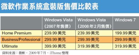微軟日前公布新一代作業系統Windows 7英文版售價,不管是Home Premium或Ultimate的升級版與彩盒版,都比Windows Vista略為便宜。微軟表示,目前雖然並未公布中文版售價,但可以確定的是,中文版一定會在10月22日推出。