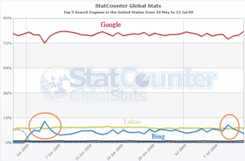 StatCounter執行長Aodhan Cullen分析,當日Bing佔有率的竄昇與紐約時報在前一天對Bing的正面報導有關。紐約時報上周三(7/8)比較了Bing與Google搜尋,並指出在許多方面Bing比Google優秀。這篇報導於周三在網路上曝光,繼之周四在平面上曝光,因此助長了Bing的市佔。