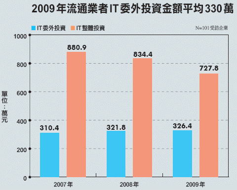 資策會MIC針對2009年臺灣流通業資訊科技投資調查顯示,2009年企業整體IT投資平均為727.8萬元,其中IT委外金額平均為326.4萬元。資策會MIC表示,今年IT整體投資金額比去年減少106.6萬元,減少幅度達12.3%,但IT委外的投資金額,今年卻比去年增加4.6萬元,成長幅度1.41%。