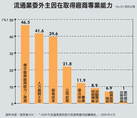 根據資策會MIC對流通業資訊委外投資金額的調查,2009年流通業整體IT委外投資金額平均為326.4萬元,比2008年增加4.6萬元,其中零售業整體委外比例最高。在委外項目上,IT委外比流程委外更多,流通業採取委外的主要原因,在於尋求專業能力與資源。