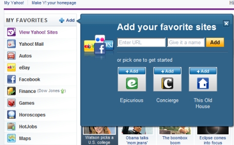 新Yahoo首頁的左列有「我的最愛」(My Favorites)名單,列出各種Yahoo內部或其他業者所提供的網路服務,使用者可自行編輯該名單。當使用者把滑鼠移到特定網路服務上(例如Facebook)時,會跳出一個可直接在Yahoo上檢視Facebook內容的視窗,並伴隨著廣告。