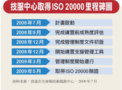 黃小玲表示,ISO 27001施行在前,技服中心的作法就是以ISO 27001的表單規範為基礎,加入ISO 20000的規定,這個步驟也是ISO 20000導入過程中,較為容易的部分。