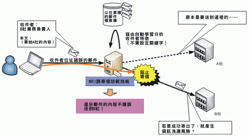 NRI並說明,這項防止信件誤送的技術也包括偵測垃圾郵件,同時能與現有的郵件系統結合使用,如此即可防止使用者按錯收信人或夾帶錯誤檔案等問題,對企業資來說可達防患於未然的功用。(編譯/張嵐霆)