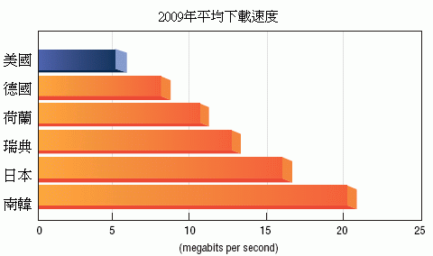 在2009的測試數據裡,只有20%的美國網友的上網速度達到世界前三名的水準,也就是南韓、日本,及瑞典。但比較難看的是,竟有18%網友的連線速度未達FCC目前所定義的寬頻標準:隨時連線的下傳速度(downstream)至少達768kbps。
