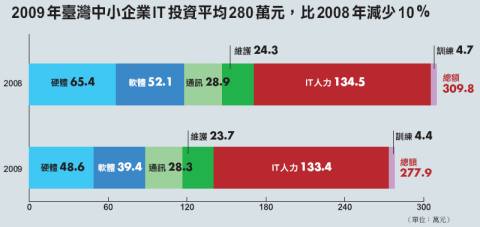資策會MIC調查指出,在2009年中小企業在人事成本的投資最高,超過130(133.4)萬元,其次為硬體投資的50(48.6)萬元,第三為軟體投資的金額將近40(39.4)萬元。從該份調查中發現,中小企業對於IT訓練的金額最低,不到5萬元(4.4元)。資策會MIC表示,分析臺灣中小企業在2009年資訊發展困難的原因,最大的困難就是預算不足(45.4%),其次為跨系統整合(35.4%)和投資效益難評估(34.2%)。資策會MIC此次針對中小企業進行的IT人力調查,500家中小企業中,5成以上中小企業聘僱IT人員少於1人,9成以上的中小企業聘僱IT人員少於5人。